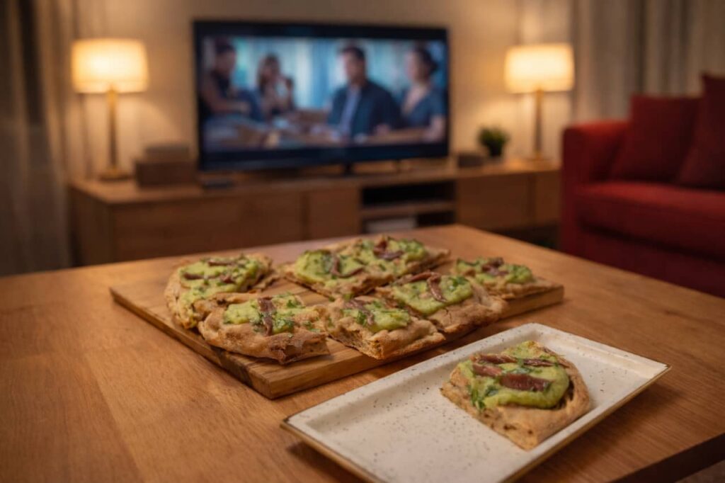 La Pinsa risponde praticamente a tutte le caratteristiche che abbiamo visto. Si prepara in pochi minuti, si taglia facilmente e si mangia senza difficoltà anche sul divano. Non serve impiattare, non servono posate, e soprattutto resta buona fino all’ultimo pezzo, anche se il film prende e ti dimentichi per un po’ di quello che c’è sul tavolino.